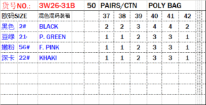 50PRS/CTN,黑色BLACK豆绿P. GREEN嫩粉F. PINK深卡KHAKI,SIZE:37-42,POLY BAG,混色混码装