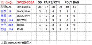 50PRS/CTN,黑灰BLACK/GRAY黑蓝BLACK/NAVY棕色BROWN米色BEIGE肉粉PINK,SIZE:36-41,POLY BAG,混色混码装