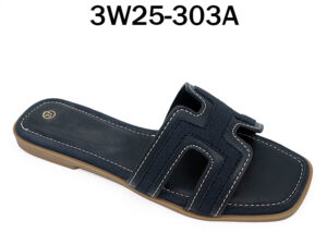 These women’s slide sandals feature a chic navy blue hue and a distinctive H-style upper design. With open-toe construction, they offer breathability and comfort. Crafted with quality materials, they have neat white stitching and a durable brown outsole. Perfect for casual daily wear, adding a touch of elegance to your summer look. Ideal for those seeking both style and ease.