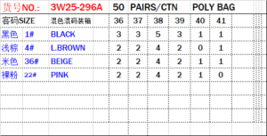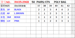 50PRS/CTN,黑色BLACK浅棕L.BROWN米色BEIGE裸粉PINK,SIZE:36-41,POLY BAG,混色混码装