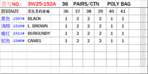36PRS/CTN,黑色BLACK浅棕L. BROWN暗红BURGUNDY驼色CAMEL,SIZE:36-41,POLY BAG,混色混码装